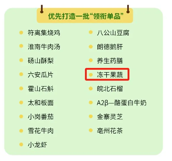 日前,安徽省政府辦公廳印發(fā)了《皖北綠色食品產(chǎn)業(yè)集群建設實施方案》。方案提出,發(fā)揮皖北空間、資源、市場優(yōu)勢,堅持種養(yǎng)一塊抓、糧肉一塊抓、頭尾一塊抓,做好“糧頭食尾”“畜頭肉尾”“農(nóng)頭工尾”增值大文章。高起點打造綠色食品的新產(chǎn)業(yè)、新技術、新模式、新業(yè)態(tài),構建全新產(chǎn)業(yè)生態(tài),加快建設結構合理、鏈條完整、布局優(yōu)化、規(guī)模巨大的皖北綠色食品產(chǎn)業(yè)集群,推進長三角綠色農(nóng)產(chǎn)品生產(chǎn)加工供應基地高質量發(fā)展。其中,方案明確要優(yōu)先打造一批“領銜單品”,其中凍干果蔬在列。