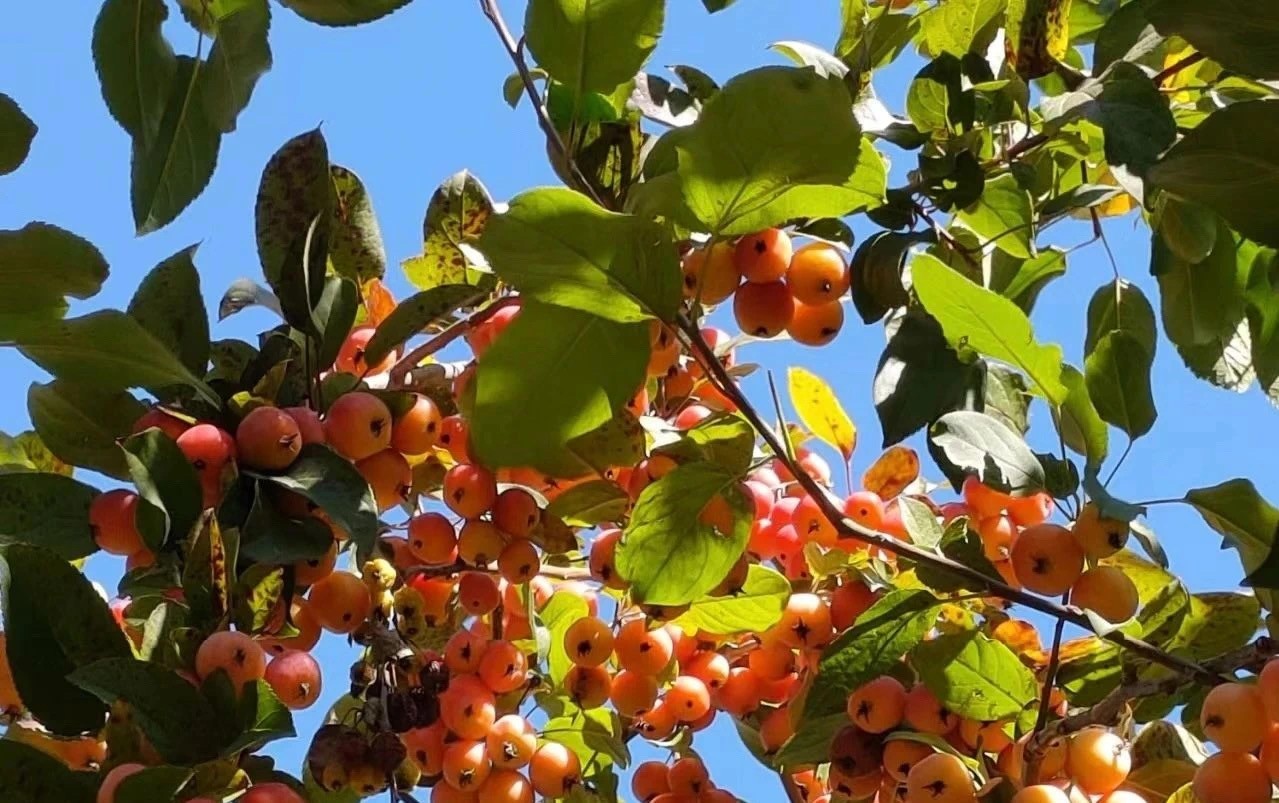紅瑪瑙般的山楂掛滿(mǎn)了枝頭,一串串、一簇簇,十分惹眼。還有石榴,柿子,紅棗......美不勝收,到處都是欣欣向榮的收獲景象。