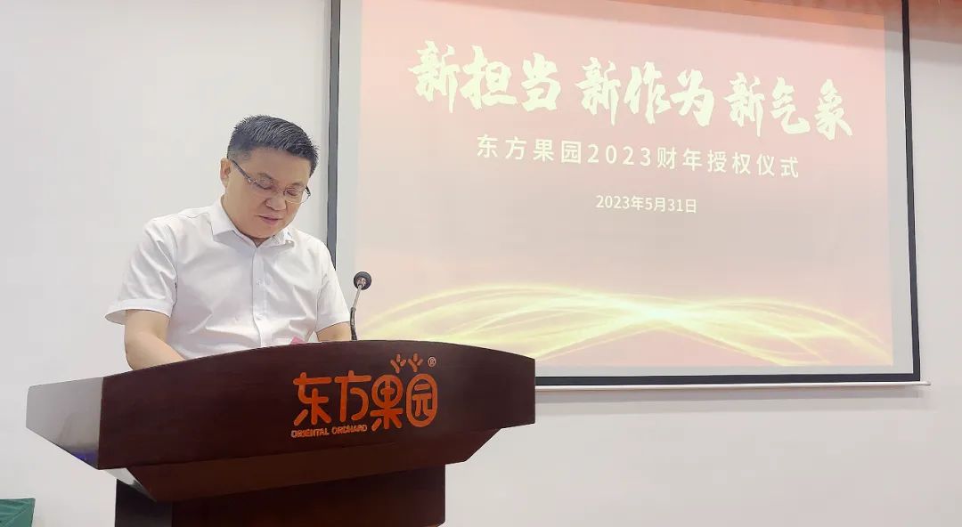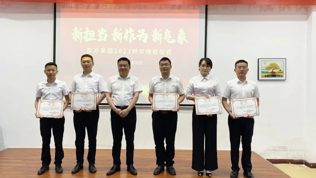 5月31日下午,東方果園集團“新?lián)?新作為 新氣象”2022財年表彰大會暨2023財年授權儀式在安徽省食品安全研學基地隆重舉行。集團董事長張仲君、輪值總經(jīng)理崔文艷,與營銷中心、東方因子、供應鏈中心、生產(chǎn)中心、職能中心、審計督導部、財務部、品控部管理層出席會議。