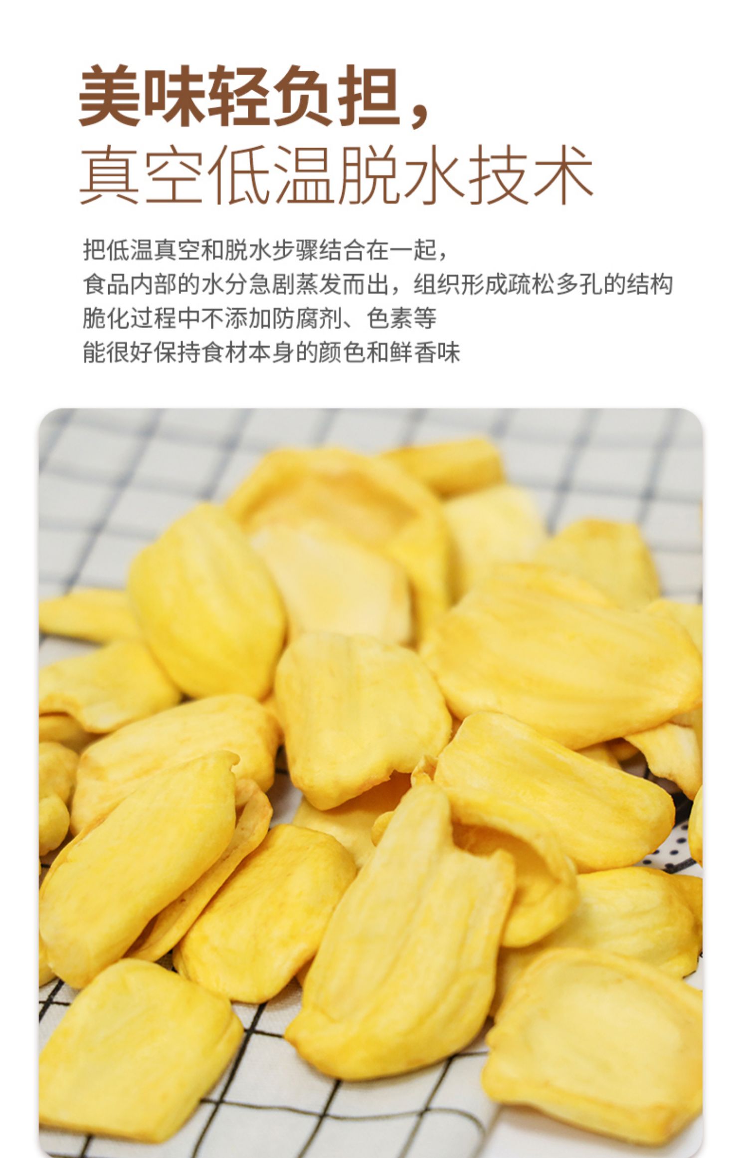 把低溫真空和脫水步驟結合在一起,食品內(nèi)部的水分急劇蒸發(fā)而出,組織形成疏松多孔的結構 脆化過程中不添加防腐劑、色素等能很好保持食材本身的顏色和鮮香味